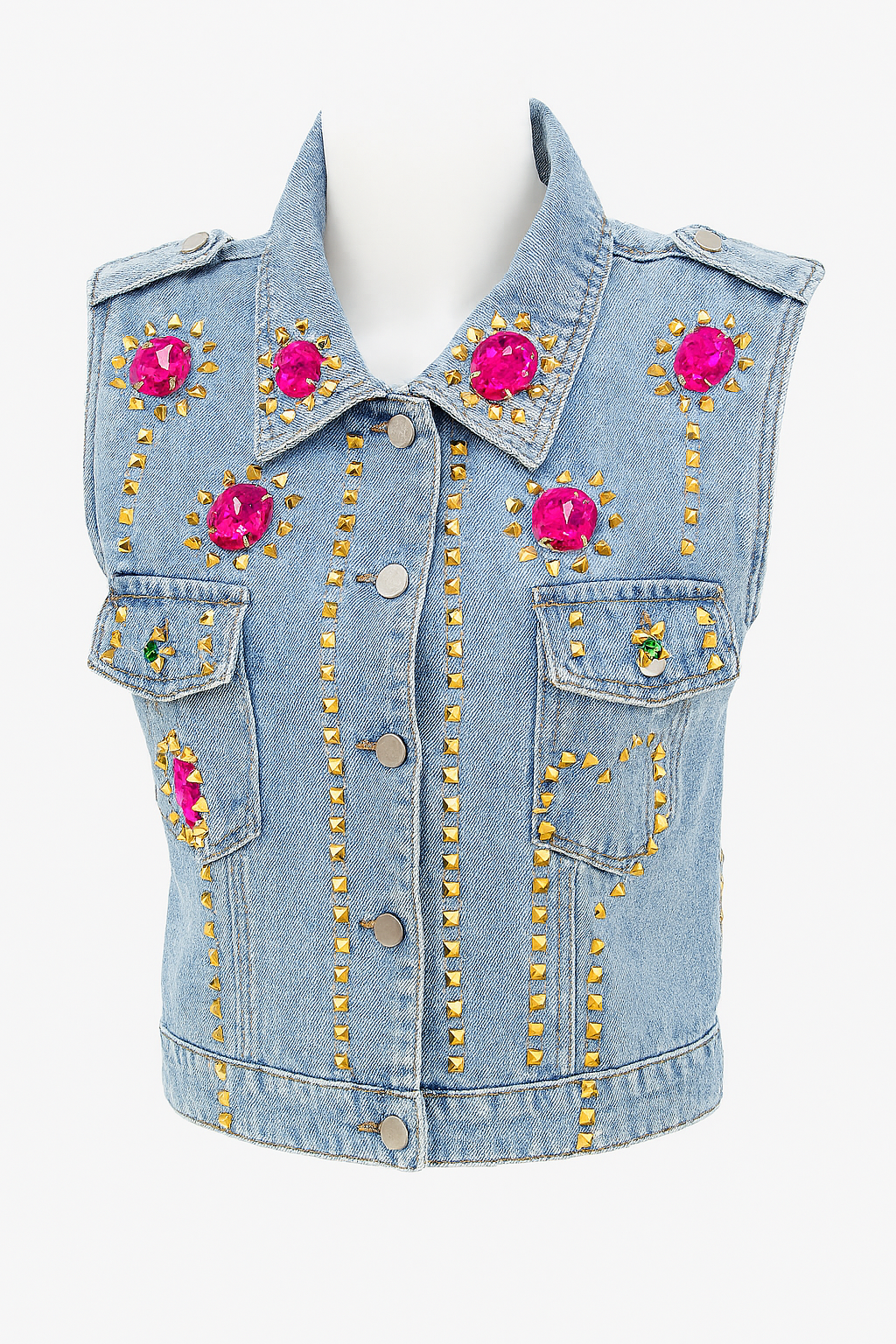 Chaleco vaquero con pedrería en colores vibrantes. Un toque atrevido y lleno de estilo para cualquier look.
