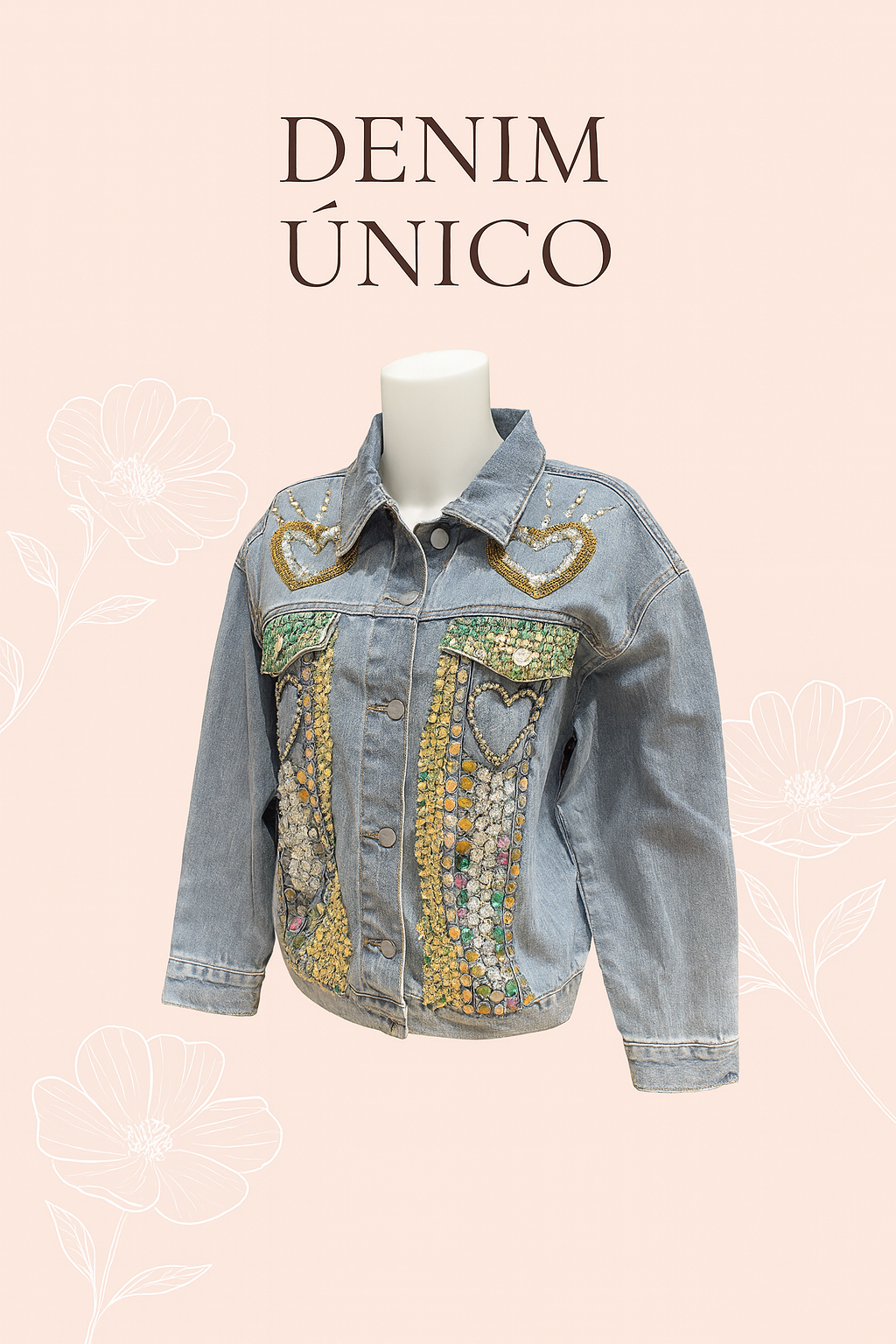 Chaqueta vaquera con corazones, piedras y lentejuelas multicolor. Una prenda versátil y llamativa para destacar con estilo en cualquier ocasión.