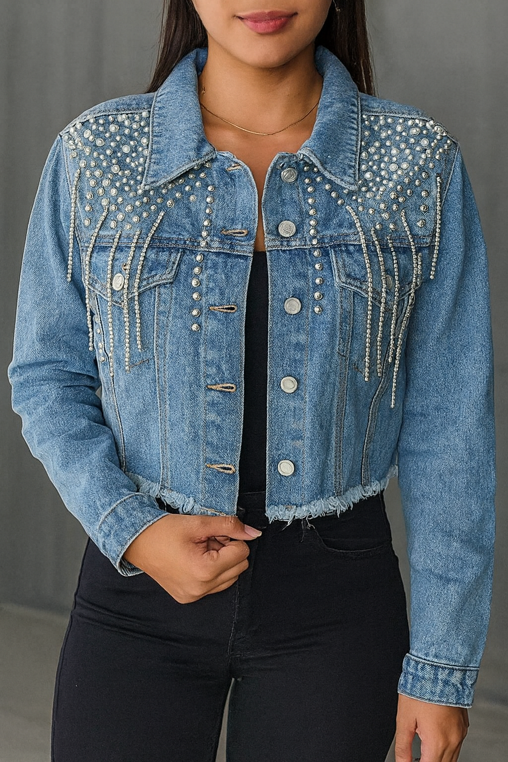 Chaqueta vaquera con tachuelas y flecos brillantes. Corte recto y acabado desgastado para un look con personalidad.